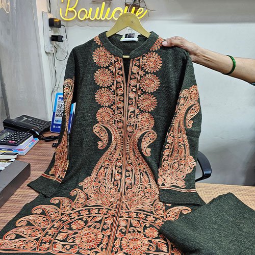Exclusively available at our boutique — embrace the warmth of wool and the artistry of Kashmiri embroidery in one elegant ensemble.