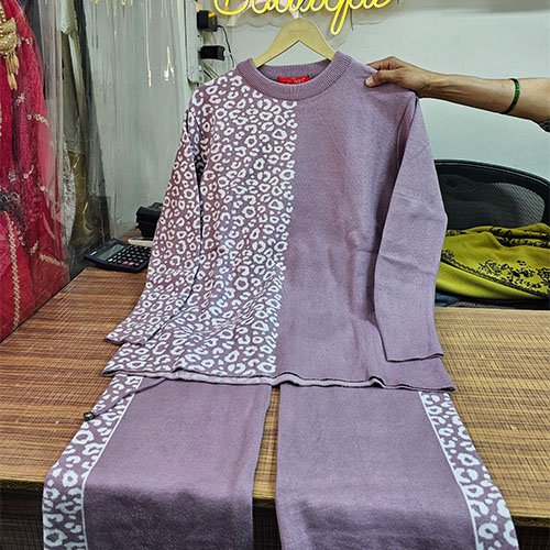 The set features a coordinated top and bottom in complementary shades, designed to create a balanced and chic look effortlessly. The rich mustard paired with soft light purple gives a vibrant yet subtle appeal, making it perfect for both casual outings and festive occasions. The woolen fabric provides cozy warmth, ideal for winter days and evenings.