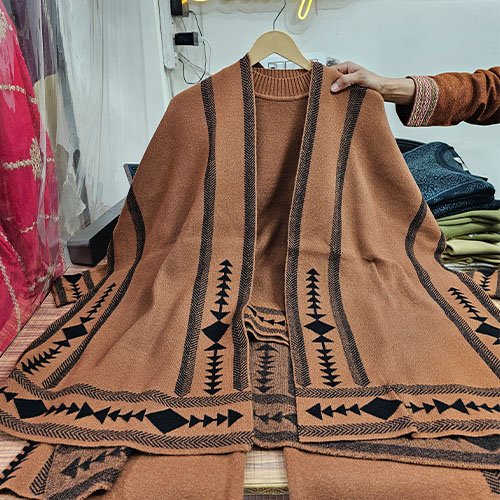 This elegant three-piece set includes a stylish top, matching trousers, and a coordinated long shrug that adds an extra layer of charm and coziness. The shrug features a graceful fall and refined finish, giving the outfit a premium winter appeal perfect for daily wear, office looks, and festive gatherings.