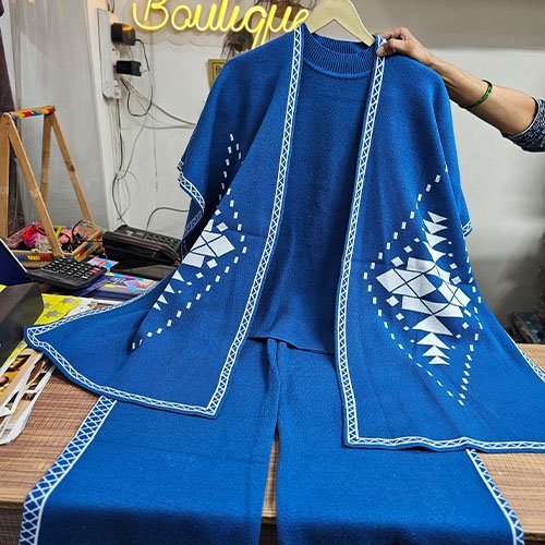 This elegant three-piece set includes a stylish top, matching trousers, and a coordinated long shrug that adds an extra layer of charm and coziness. The shrug features a graceful fall and refined finish, giving the outfit a premium winter appeal perfect for daily wear, office looks, and festive gatherings.