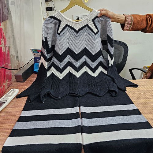 Elevate your winter look with our Premium Zig-Zag Woolen Co-ord Set, crafted to combine comfort and style effortlessly. The elegant black shade paired with a unique zig-zag textured pattern adds a sophisticated touch to your wardrobe. Made from high-quality woolen fabric, it provides warmth without compromising on breathability or comfort.